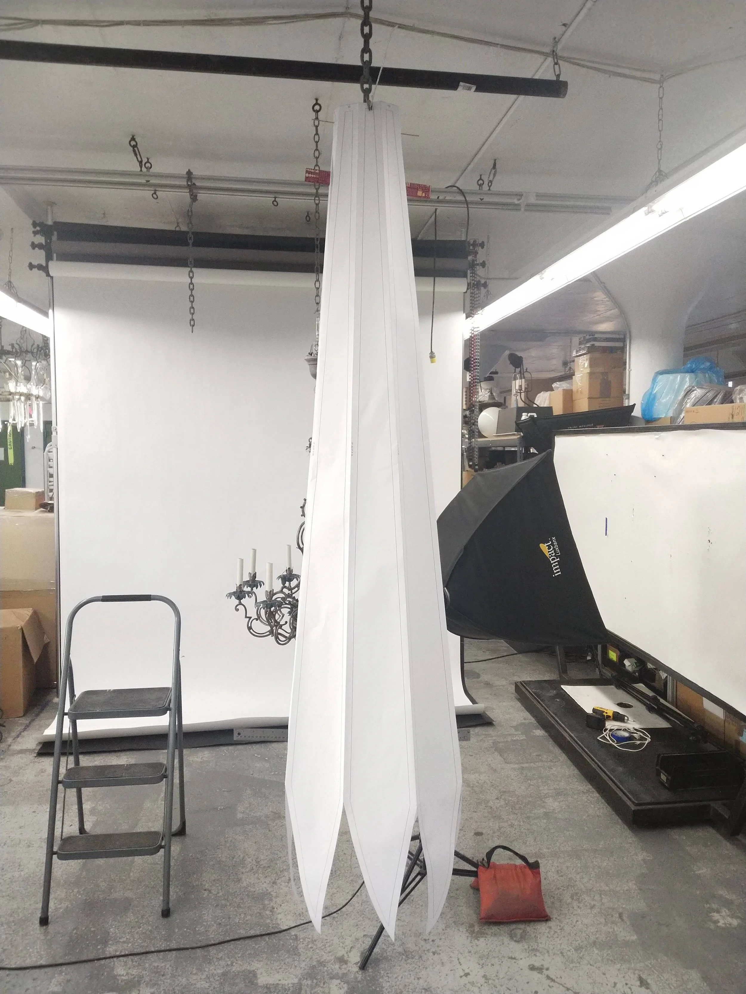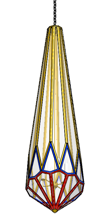 Since we didn’t have the capabilities to make a large stained-glass-style assembly, I devised a method to make the fixture from large bent sheet metal sections. This required custom glazing bars (which hold the glass in place)